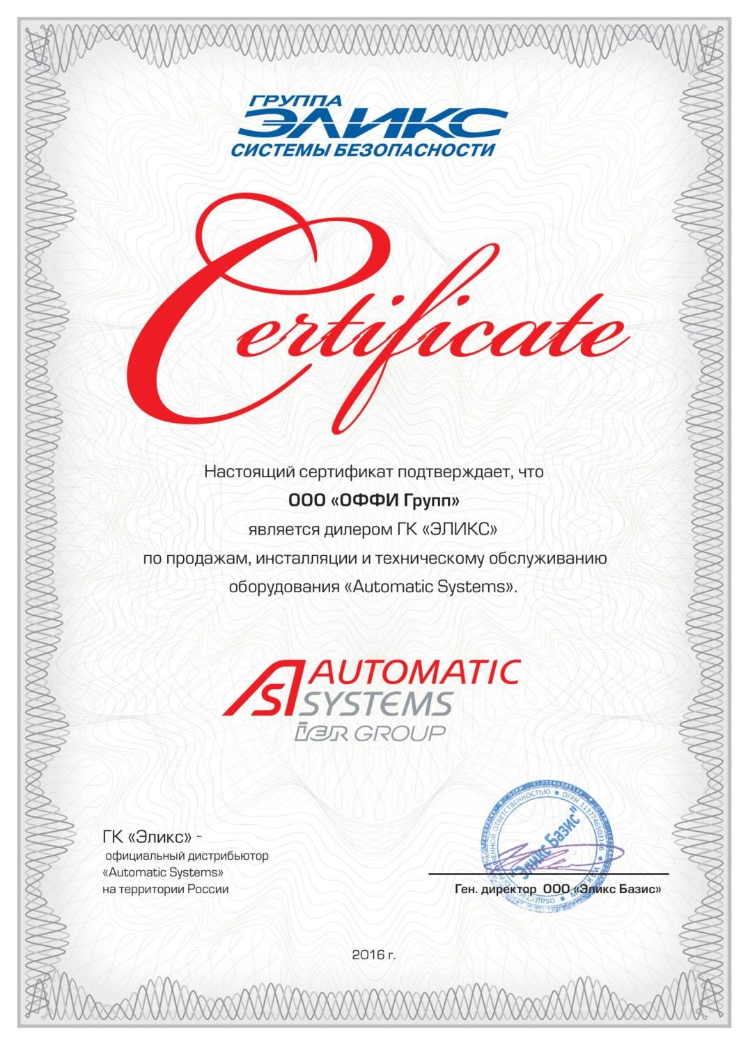 Сертификат Automatic Systems для ООО "ОФФИ Групп"