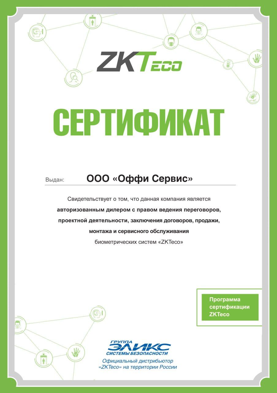 Сертификат ZKTeco для ООО "ОФФИ Сервис"
