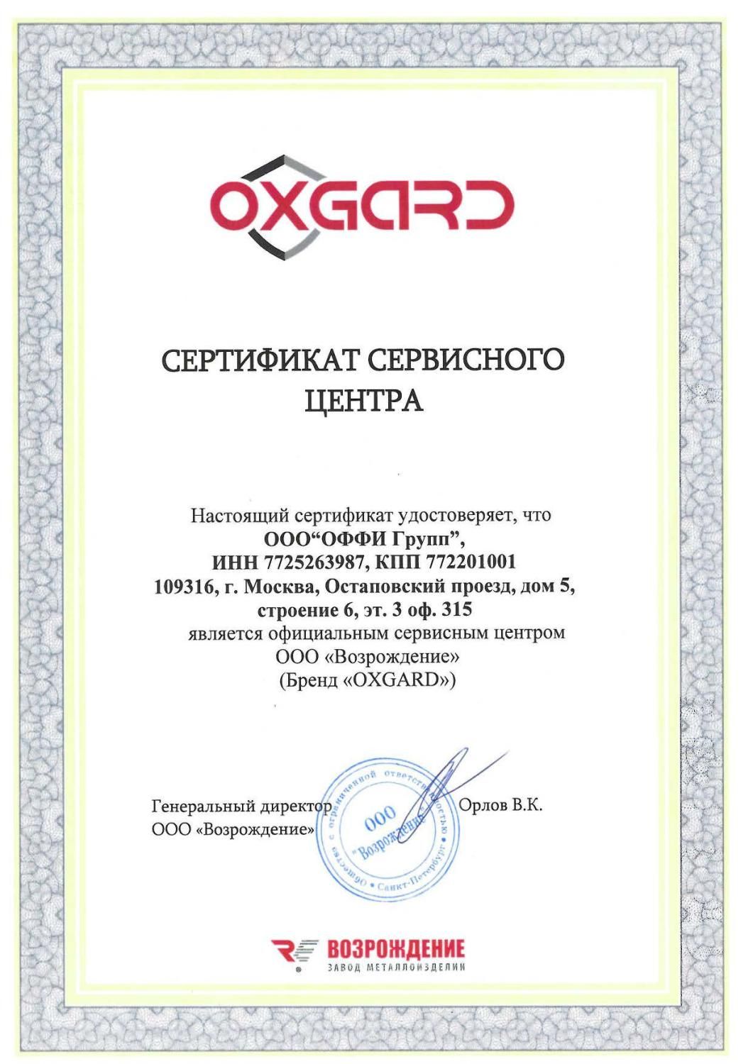 Сертификат подтверждающий полномочия официального сервисного центра OXGARD.